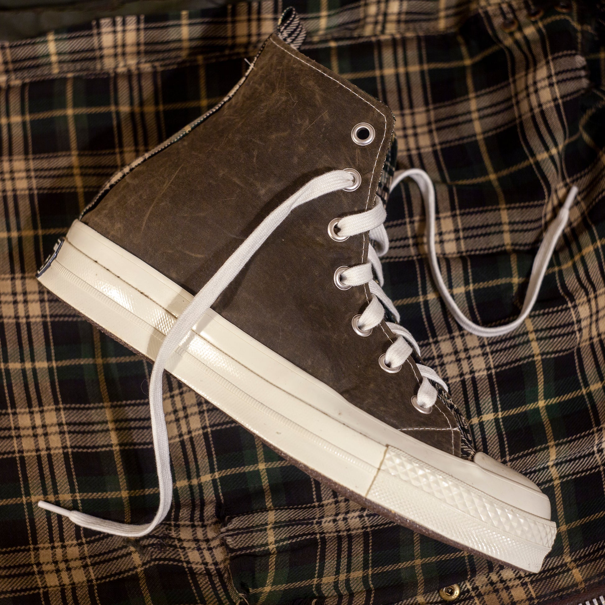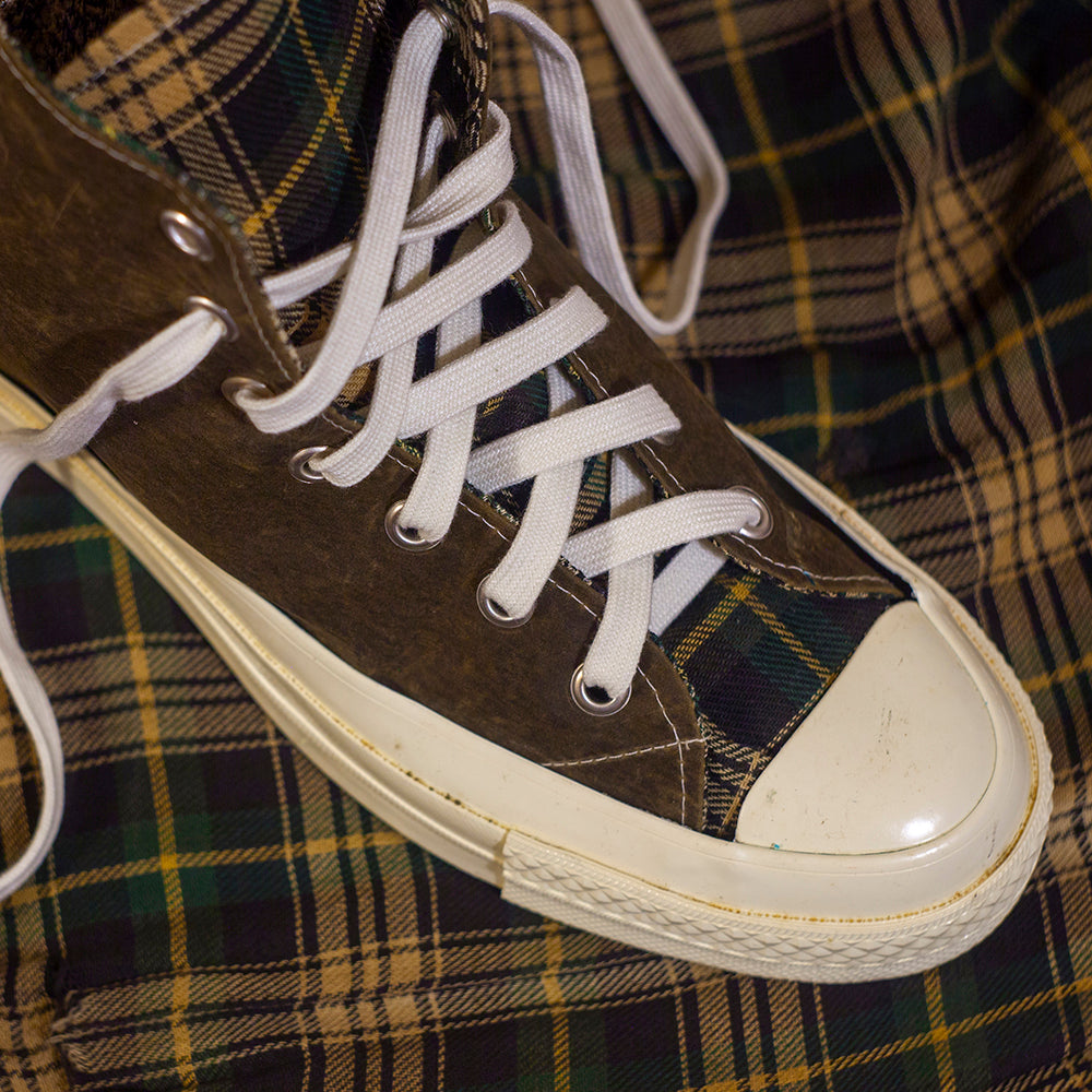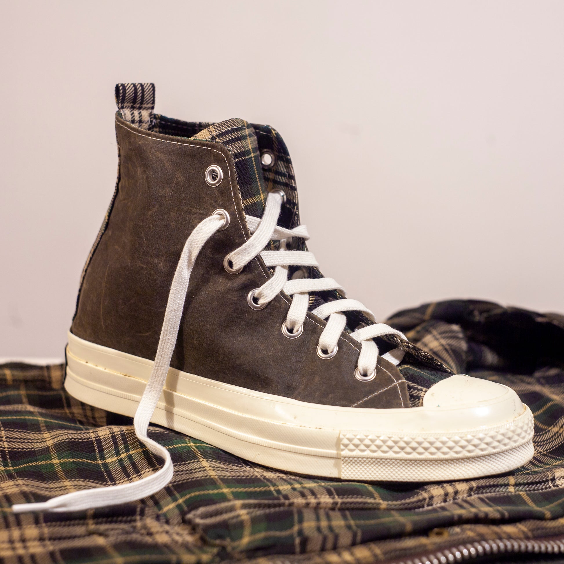 Sneakers gemaakt van een vintage Barbour-jas en Converse 70-zolen.