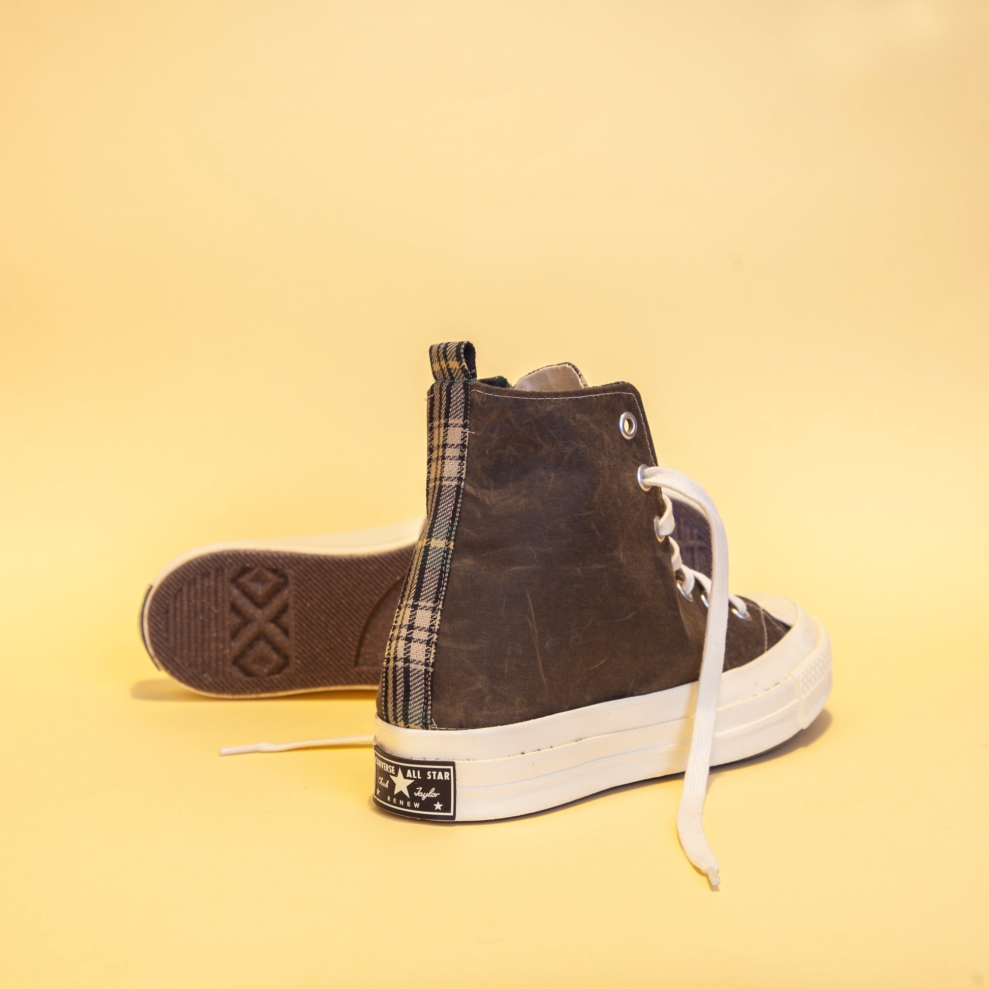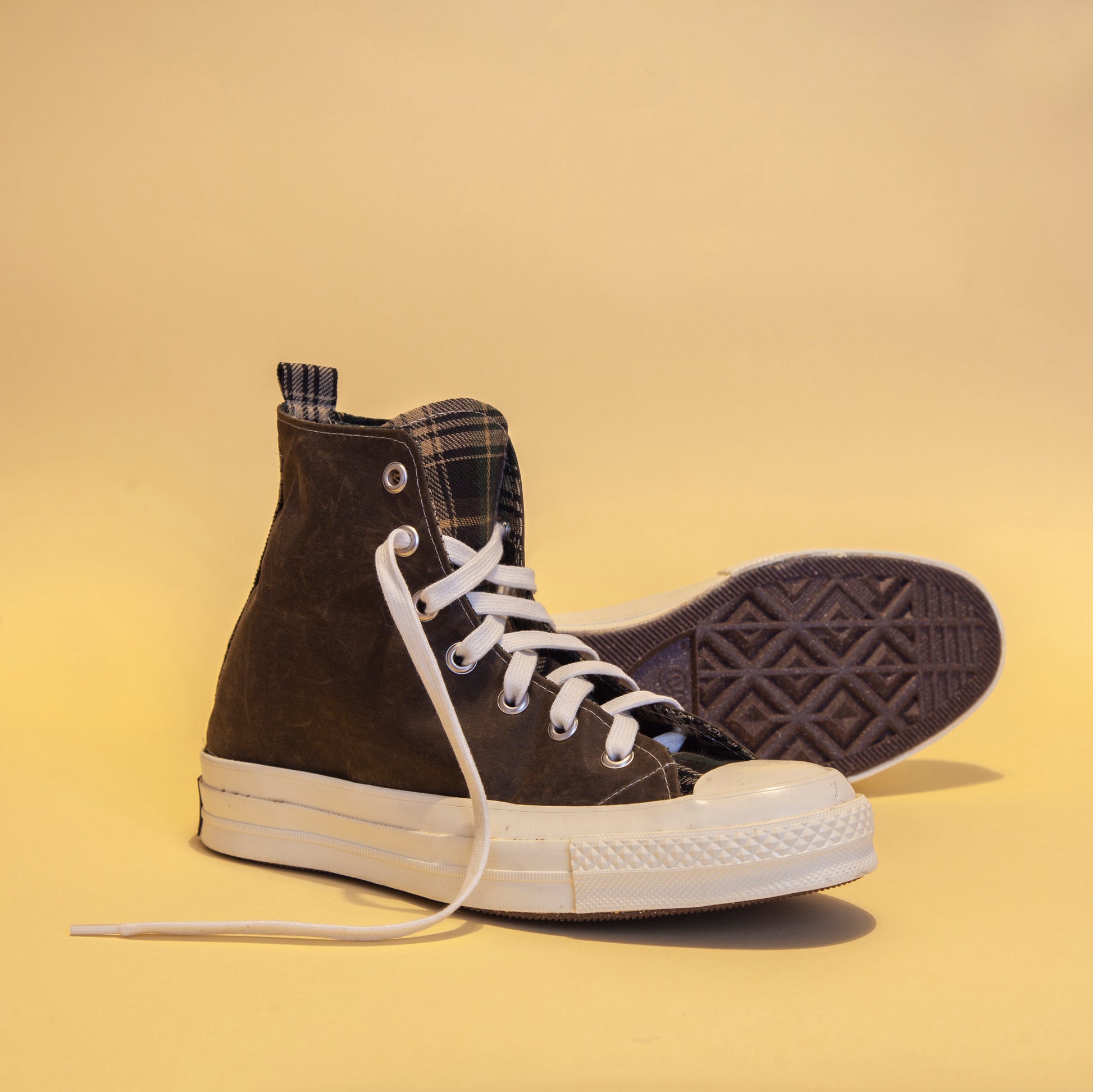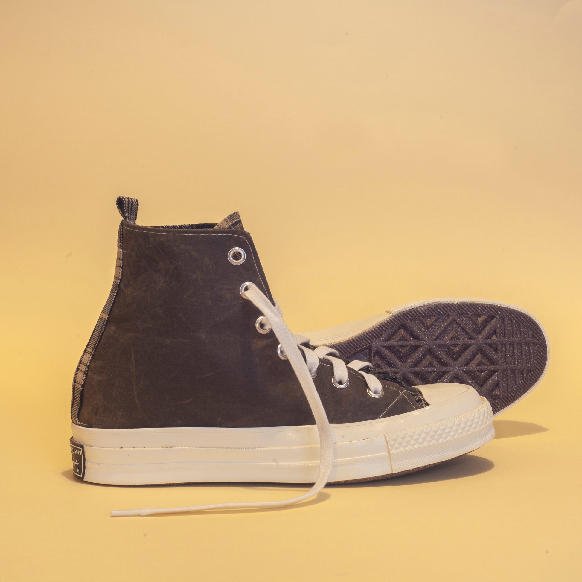 Sneakers gemaakt van een vintage Barbour-jas en Converse 70-zolen.